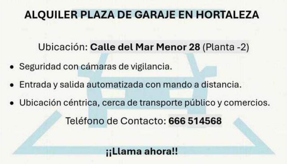 ¡ALQUILER PLAZA DE GARAJE EN HORTALEZA SOLO 75MES! ?