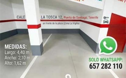 Plaza de garaje muy céntrica frente a la plaza la Vigilia, en Puerto Santiago, Santiago del Teide, sur de Tenerife. Ideal para vehículo pequeño. Medidas descritas en la foto: ancho 2,10 m, Largo 4,4 m y altura más corta 1,62 m. Edificio en exelente estado. Mando a distancia puerta mecánica.