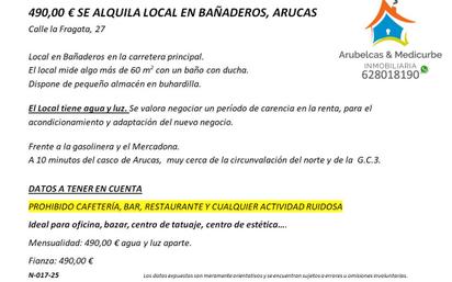 490,00 € SE ALQUILA LOCAL EN BAÑADEROS, ARUCAS Avenida de Lairaga, 27. Local en Bañaderos en la carretera principal. El local mide algo más de 60 m2 con un baño con ducha. Dispone de pequeño almacén en buhardilla. El Local tiene agua y luz. Se valora negociar un período de carencia en la renta, para el acondicionamiento y adaptación del nuevo negocio. Frente a la gasolinera y el Mercadona. A 10 minutos del casco de Arucas, muy cerca de la circunvalación del norte y de la G.C.3. DATOS A TENER EN CUENTA PROHIBIDO CAFETERÍA, BAR, RESTAURANTE Y CUALQUIER ACTIVIDAD RUIDOSA Ideal para oficina, bazar, centro de tatuaje, centro de estética…. Mensualidad: 490,00 € agua y luz aparte. Fianza: 490,00 € N-017-25 Los datos expuestos son meramente orientativos y se encuentran sujetos a errores u omisiones involuntarias.
