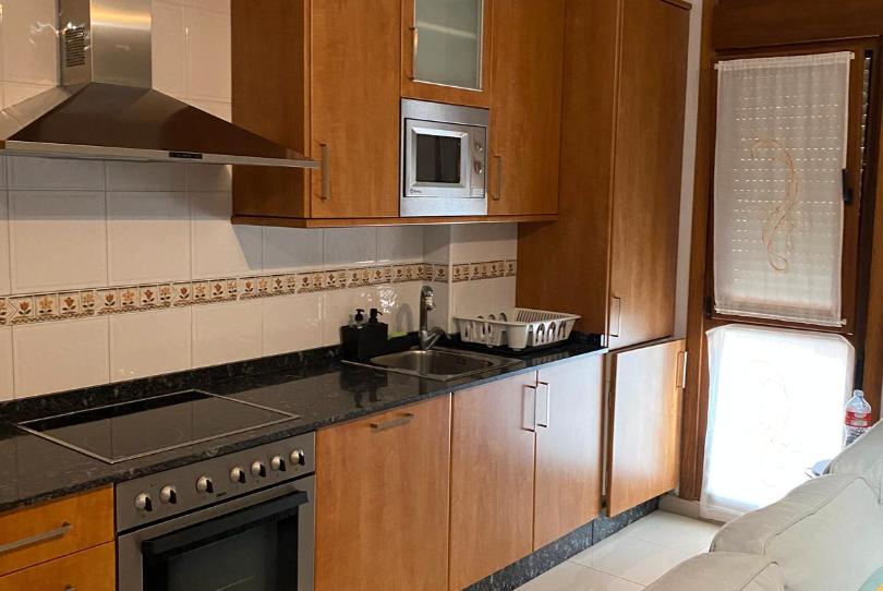 La cocina tiene placa vitrocerámica, horno, campana extractora, frigorífico-combi, microondas, termo eléctrico para el agua caliente y lavadora.