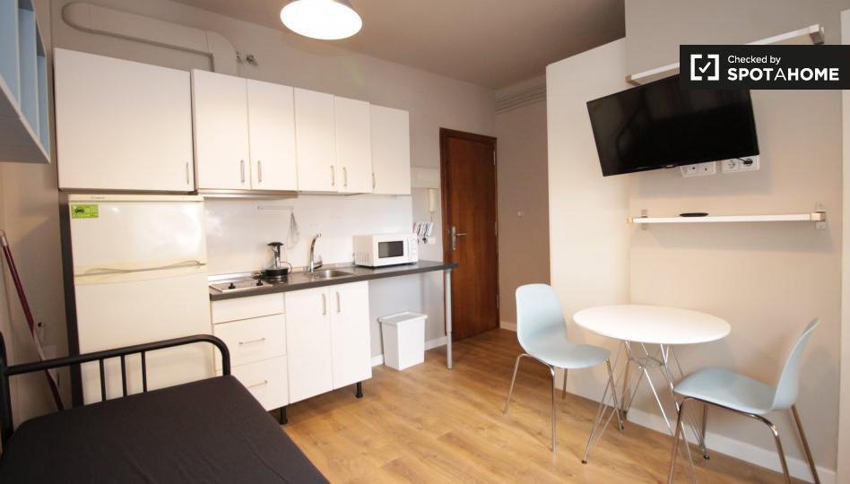 Este estudio compacto está disponible para alquilar en el barrio de Sant Andreu de Barcelona. Tiene una cama individual que se puede ampliar en un doble, y, al lado, una pequeña mesa que se puede colocar delante de usted para que pueda ver la pared, TV de pantalla plana mientras come. Si lo prefiere, también hay una pequeña mesa de comedor y sillas. ¡La decisión es tuya! La cocina está totalmente equipada y aunque no tiene un horno, hay un microondas. Hay estantes por encima de la cama, y 2 ventanas grandes que permiten en abundancia de luz natural.