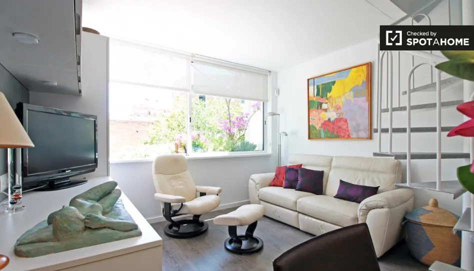 Este apartamento de 60 m², de 2 dormitorios disponible para alquilar es un impresionante dúplex situado a pocos pasos del famoso Parque Güell de Gaudí. La planta baja tiene salón abierto y cocina con grandes ventanales con vistas a una vista panorámica. La escalera de caracol te lleva arriba donde se encuentra la gran habitación doble y la segunda habitación doble. En la planta superior se encuentra el elegante baño.