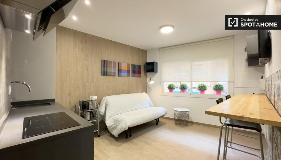 Se alquila estudio amueblado en Carrer De Les Torres. La vivienda se encuentra en la 1ª planta de un edificio con ascensor. La propiedad incluye aire acondicionado.