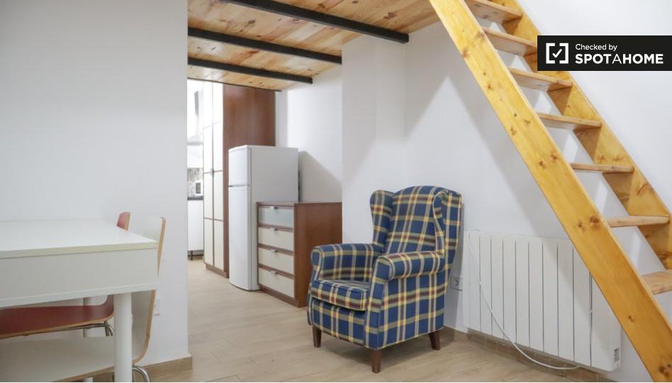 Bienvenido a este estudio completamente amueblado en alquiler en Canillejas, Madrid. El estudio es exterior y está equipado con aire acondicionado individual, lavadora y TV. La cocina está totalmente equipada, incluyendo horno, lo que facilita la preparación de comidas. El anuncio incluye wifi. No se permite fumar ni se admiten mascotas, y la propiedad no dispone de secadora ni lavavajillas. Spotahome ha revisado y verificado personalmente esta propiedad.
