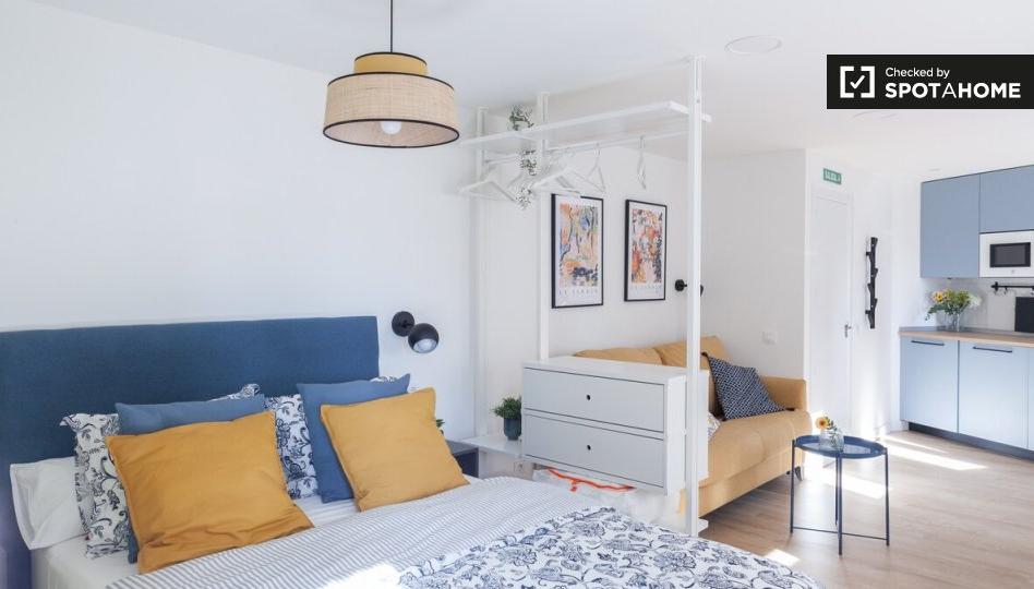 Se alquila monoambiente amueblado en C. Del Pinar Del Rey. La vivienda se encuentra en la planta baja de un edificio con ascensor. La propiedad incluye aire acondicionado.