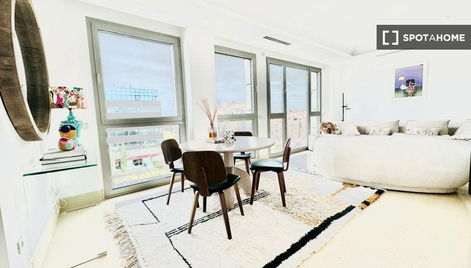 Imagínate viviendo en un encantador apartamento de 2 habitaciones en el barrio de Palomas, Madrid. Esta residencia, completamente amueblada, ofrece comodidad con comodidades como aire acondicionado y calefacción central, lavadora y secadora privadas, y una cocina totalmente equipada con lavavajillas, horno y TV. Spotahome ha revisado personalmente la propiedad, garantizando su calidad y fiabilidad. Los gastos de agua, gas, electricidad (con límite) y wifi están incluidos.