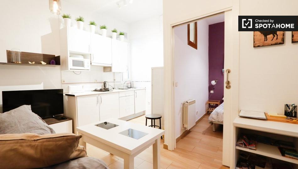 ** El increíble ahorro de espacio ** _Porque no se trata de lo que tienes, sino de cómo lo usas_ ** ¿Me gustará aquí? ** Lo harás si te gusta un big bang por tu dinero. Si es así, admirarás este espacio bien pensado. El baño tiene una lavadora, un gran momento y ahorro de espacio. **¿De Verdad? Dime más...** Estarás justo en el corazón de la moda de Malasaña. Compra en las mejores tiendas vintage. O consigue una cerveza en un bar de moda. Cuando quiera explorar otros vecindarios, una estación de metro está a solo dos minutos. Creemos que este apartamento sería ideal para las personas que quieren estar en el medio de las cosas, pero que también aprecian su tiempo a solas. Retírese a su propio espacio después de una noche en la ciudad. Tu habitación es una habitación interior. Ninguna luz te despertará. ** Sus 3 razones principales para vivir aquí: ** - Nos encanta la cocina de concepto abierto, hermosa y práctica. - Te dan un lavadero en el baño. - Te encantará estar en el centro de los barrios más populares de Madrid. ** Pero necesitas saber esto ... ** - El dormitorio no tiene ventana. Descansa los fines de semana sin ruidos ni sol. ** Tu verificador de casa, Belen, dijo: ** _ \"Este encantador apartamento está en una ubicación increíble.\" _ ** Ayúdame a decidirme ... ** Este es un apartamento de 1 dormitorio en la calle de San Vicente Ferrer, Madrid. Está justo en el medio de uno de los barrios más geniales de la ciudad. Es perfecto para las personas que tienen una vida social saludable, pero también les gusta recargarse solo. Puedes caminar fácilmente a los bares y cafés de moda desde aquí. Pero también puedes mentir en los fines de semana. El sol no te molestará en tu habitación.