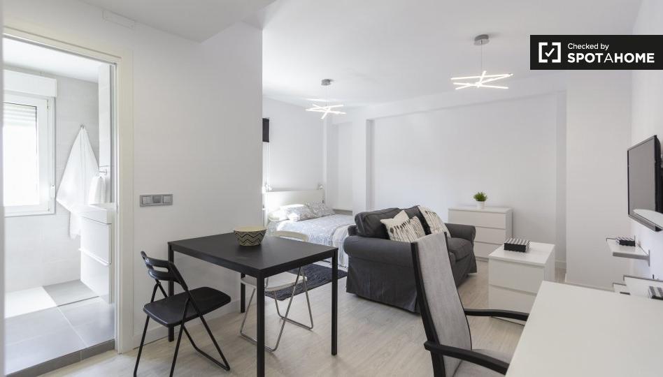 Este moderno estudio se alquila en la Avenida de Portugal en la Puerta del Ángel. La superficie de 36 m² incluye una cocina y un dormitorio combinados con una mesa y sillas y una cama doble. El baño es amplio e incluye ducha, lavabo e inodoro, además de azulejos elegantes.