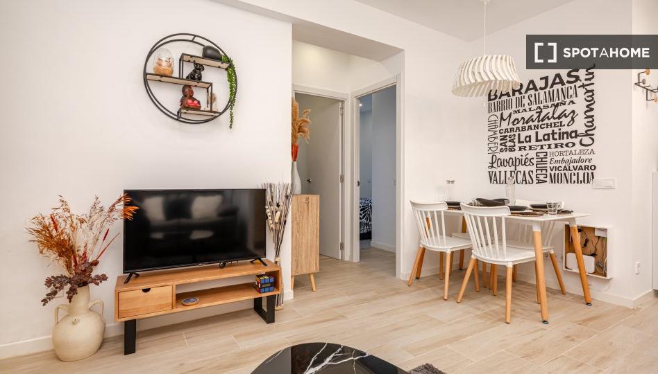 Descubra este moderno apartamento de 2 dormitorios, totalmente amueblado, en alquiler en Puerta Bonita, Madrid. La propiedad incluye aire acondicionado individual, cocina bien equipada, lavadora y TV. Dispone de wifi para que se mantenga conectado. Se admiten parejas y se permiten invitados. La propiedad ha sido revisada por Spotahome, lo que garantiza la comodidad de vivir aquí.