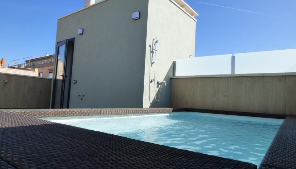 Salón comedor con cocina integrada y balcón, tres dormitorios, dos baños, armarios empotrados, y una terraza privada con pequeña piscina privada.