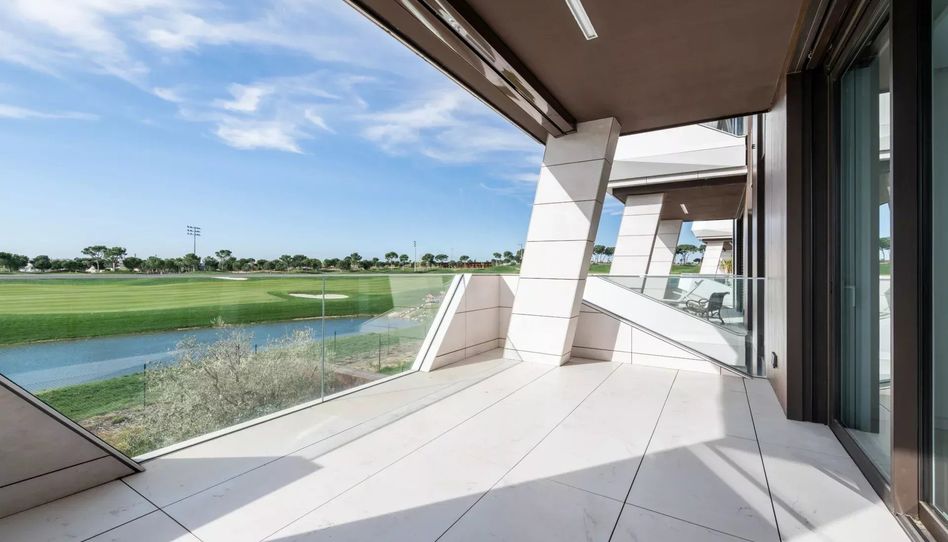La zona principal gira alrededor de un salón espectacular, abierto y muy luminoso, que conecta directamente con una gran terraza orientada al sur, con vistas despejadas al campo de golf de La Finca.