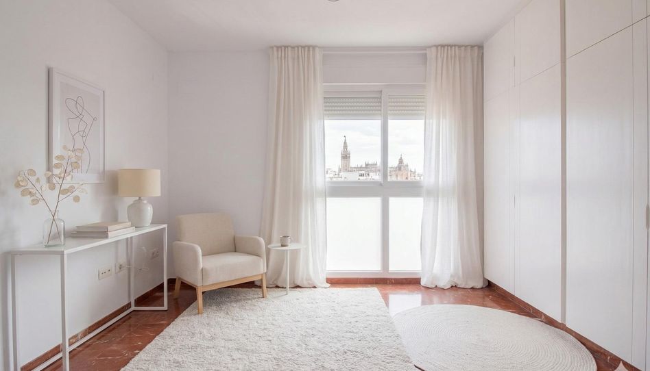 • Vistas de ensueño: El gran protagonista del salón es un espectacular y amplio ventanal que enmarca la Giralda, ofreciendo una panorámica directa y privilegiada que muy pocos pueden disfrutar.