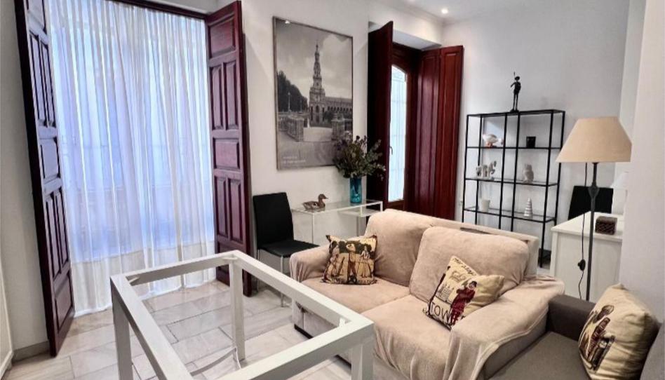Vivienda muy luminosa y de estética clásica con techos altos y suelo de mármol. El apartamento con dos habitaciones: una de matrimonio y un despacho que puede destinarse a habitación. La cocina está totalmente equipada con electrodomésticos en perfecto estado. El baño es completo con bañera. El salón es amplio con salida a un balcón con vistas a la Catedral de Sevilla. La vivienda cuenta con calefacción centralizada y aire acondicionado.