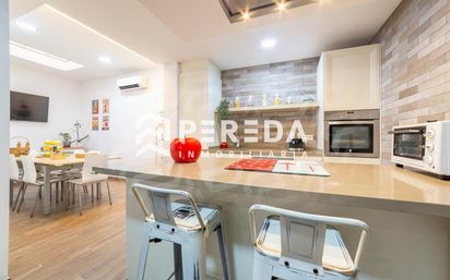 A la entrada, encontramos un bonito porche techado que da acceso a la planta baja, donde se sitúa un amplio salón con chimenea, una cocina abierta con zona de comedor (también con chimenea y aire acondicionado) y un baño completo con un gran plato de ducha.