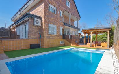 Chalé pareado de 316 m2 en parcela de 327 m2. Parcela de esquina con pérgola, piscina individual, cenador y zona ajardinada Planta calle: aseo de cortesía, cocina de diseño, muy amplia y luminosa. Salón comedor independiente con chimenea y salida a parcela. Planta primera: tres dormitorios dobles y dos baños exteriores. El dormitorio principal en suite con vestidor y baño exterior con ducha y bañera. Buhardilla: baño completo, terraza con vista despejada, zona de estar y dormitorio doble con vestidor. Planta sótano: garaje para dos vehículos en paralelo. Baño, dormitorio para servicio y sala multiusos. Ubicación extraordinaria, cerca de parada autobús y todos los servicios. Sin duda, una vivienda de ensueño. Disponible.