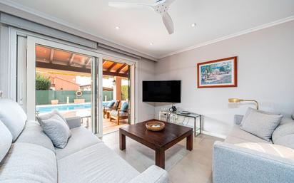 En la planta principal encontramos un amplio y luminoso salón con acceso directo al porche y a la zona de piscina, creando un espacio ideal para disfrutar tanto del interior como del exterior de la casa.
