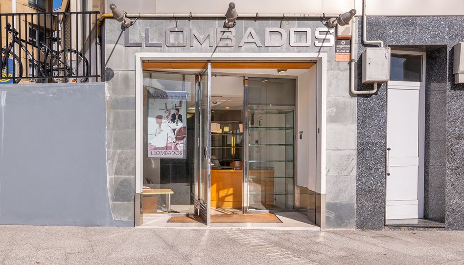 La fachada totalmente acristalada, con dos escaparates ideales para la expisoción de producto y marca, y rematada con una elegante pizarra sobre la que destaca su logo en acero LLOMBADOS, que viene de la fusión de las dos Firmas por las que discurrió la trayectoria de su propietaria en Madrid y Barcelona, LLONGUERAS Y CEBADOS tanto como salón de Peluquería como de Formación para los profesionales del sector.
