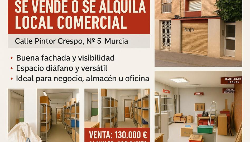Se ofrece local comercial en planta baja ubicado en Calle Actor José Crespo nº5, en una zona tranquila, bien comunicada y próxima al centro de Murcia. Un espacio amplio, versátil y con múltiples posibilidades para cualquier actividad profesional o como inversión.