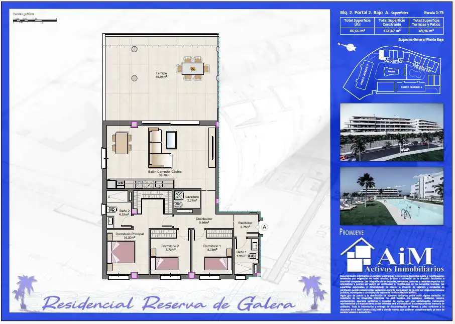 Residencial privado compuesto de 48 viviendas plurifamiliares de 2 que incluyen plaza de garaje y trastero, en caso de las viviendas de 3 dormitorios incluyen 2 plazas de garaje y trastero.