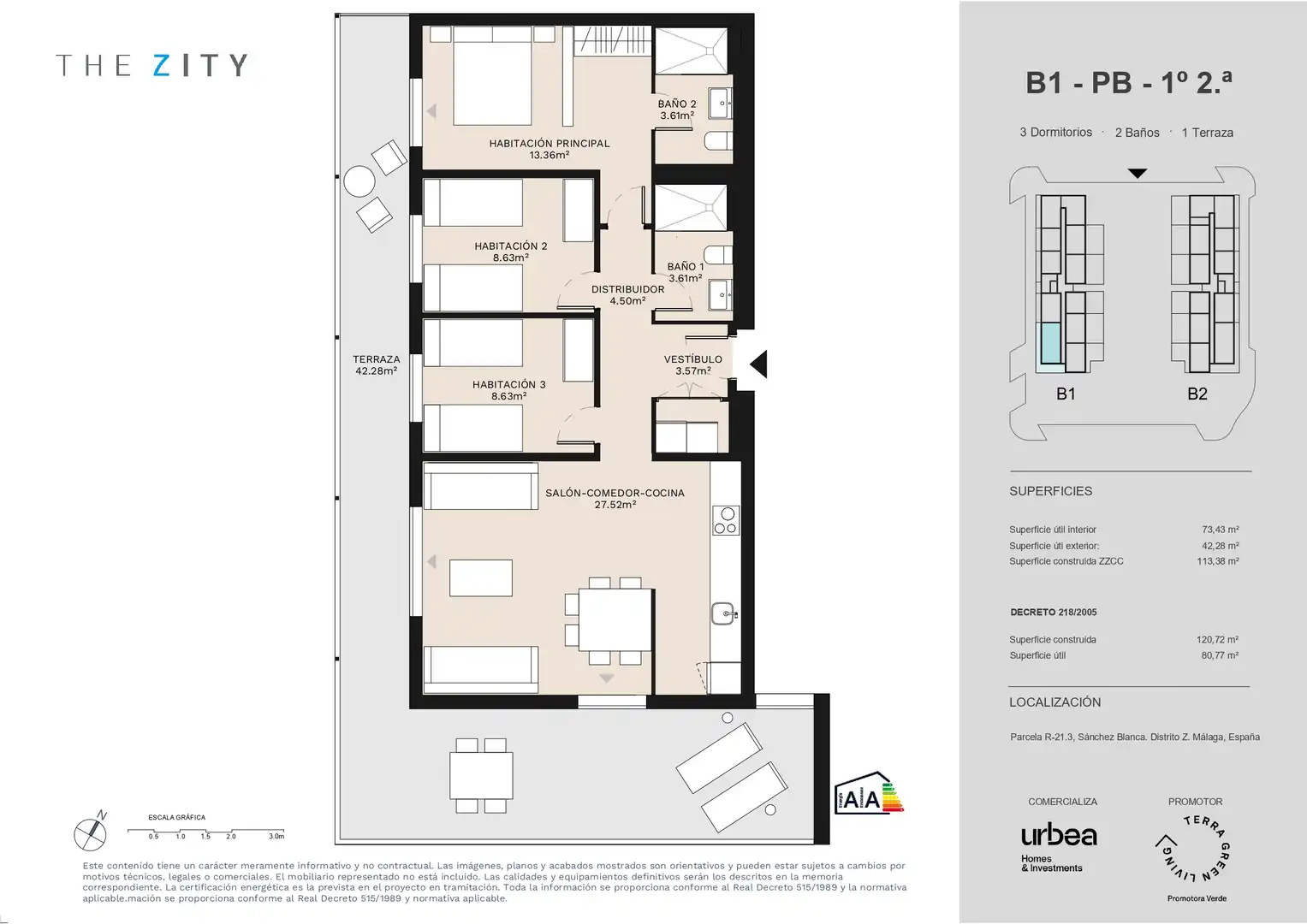 La información contenida en los planos puede estar sujeta a modificaciones previas a la finalización del proyecto. En caso de discrepancia entre la información comercial y la que resulte del último proyecto visado, prevalecerá siempre este último. Este documento es meramente informativo, sin valor contractual, y está sujeto a modificaciones por imposiciones legales, urbanísticas y/o por indicación de la dirección facultativa de las obras.