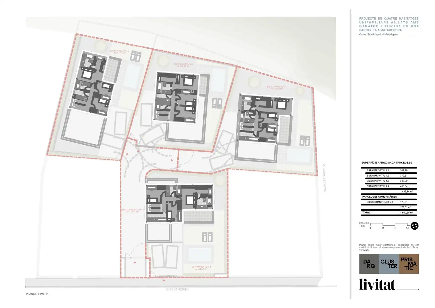 És un projecte de 4 cases situat, al meu criteri, en la millor zona de Matadepera: lluny del soroll del centre i de la carretera, envoltat d’arbres i tranquil·litat, però a només 2 minuts caminant de la plaça Sant Jordi i de les parades d’autobús. Un entorn privilegiat i còmode alhora.