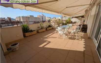 MAGNIFICO ATICO EN VENTA EN EL CENTRO DE ELDA CON UNA TERRAZA DE 63,50M2. La vivienda tiene una superficie construida de 178 m2 y se compone de salón con chimenea baja, cocina con galería, 2 baños completos, un estudio de 24m2, 2 habitaciones dobles y una habitación con baño. Todas las habitaciones y el salón dan acceso a la terraza. Muy Soleado, semi-amueblado, Ventanas climalit, ojos de buey, aire acondicionado por conductos, tarima flotante, ascensor, para entrar a vivir. Cuenta con plaza de garaje.