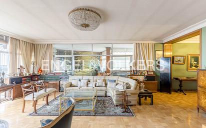 Engel & Völkers presenta este estupendo ático con dos referencias catastrales. Se trata de una vivienda y un apartamento que se unieron en el origen haciendo una casa familiar espectacular, de seis dormitorios, amplia zona de salones y comedor así como una gran cocina con terraza, lavadero y 5 baños. Dispone de dos espectaculares terrazas. Entramos a la propiedad accediendo a través de un ascensor directo a su planta, nos damos paso a un cómodo vestíbulo que da comunicación a sus distintas zonas. En la zona de día dispone de un amplio salón que da a una de las terrazas y comedor con ventanales corridos a la segunda terraza. Hay una parte de la terraza que hace esquina que se acristalado en su momento pero se podría recuperar. La cocina dispone de office y una estupenda zona de lavandería y de una entrada de servicio. La zona de noche tiene cuatro dormitorios, uno más de servicio con baño en suite y un despacho que se podría recuperar como 6º dormitorio. Dispone de un total de 6 baños. La finca tiene el prestigio de ser Premio de Arquitectura, preservando numerosos detalles singulares del concepto original del arquitecto Juan de Haro, edificio de imagen irrepetible gracias a su celosía de lamas metálicas y gran altura que lo aísla por completo del ritmo urbano. Cuenta con ascensor y montacarga, portero y plaza de garaje con acceso directo desde la misma finca.(que se adjudica por la comunidad en el momento que quede uno libre). La vivienda está situada en el distrito de Chamberí, en la emblemático Paseo Francisco de Sales, disponiendo de una importante variedad de comercios y servicios: red de transporte público y autobuses, destacando la estación de metro de Islas Filipinas permitiéndonos acceder de forma rápida y eficaz a todo el centro de la capital. Zona tradicional de ocio, desde el Teatro del Canal, y la zona “verde” e instalaciones deportivas del parque de Santander, dispone de una amplia oferta de colegios, así como instalaciones hospitalarias de la Fundación Jiménez Díaz y Hospital Clínico. En breves minutos podemos incorporarnos desde la carretera de La Coruña N-VI a la carretera de Barcelona N-II, camino del aeropuerto. Muy próxima a la Ciudad Universitaria y Moncloa.