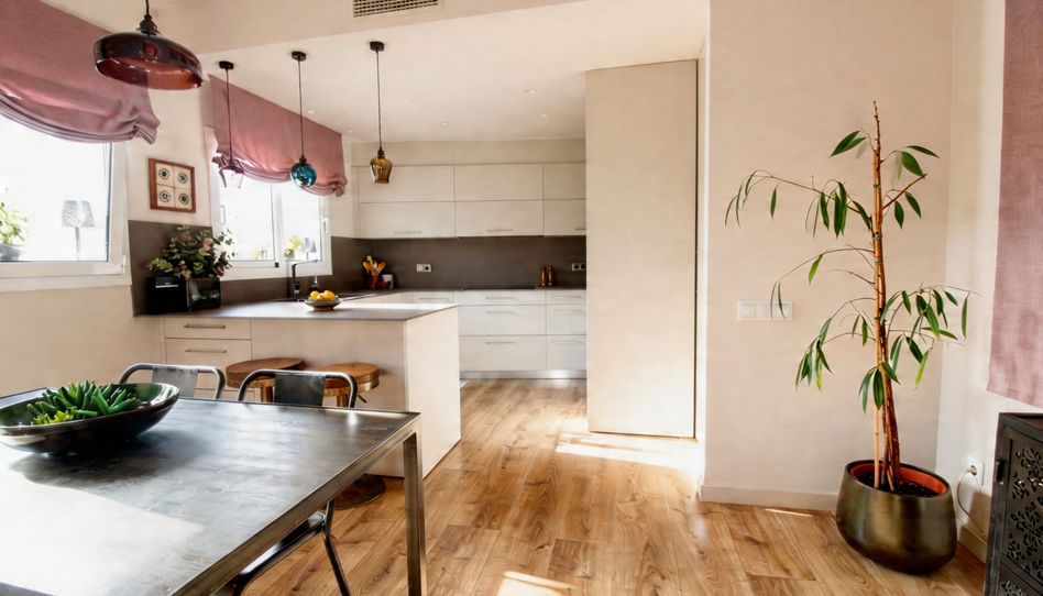 La zona de día se articula en un espacio abierto y luminoso, con salón-comedor, acompañado de una gran cocina office totalmente integrada y salida a balcón, equipada con electrodomésticos de gama alta y mobiliario que aporta continuidad estética.