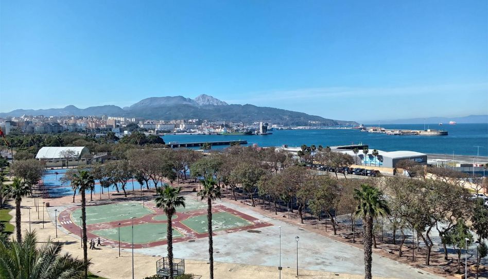 Se vende magnifico piso de 90m², 4 habitaciones convertida en 3 y una de ellas usada para ampliar cocina y hacerla cocina-comedor con barra americana, 2 baños, 5 armarios empotrados, lavadero, completamente amueblada y con electrodomesticos, para entrar a vivir, plaza de garaje, trastero y preciosas vistas desde todas las ventanas a la marina y el estrecho.
