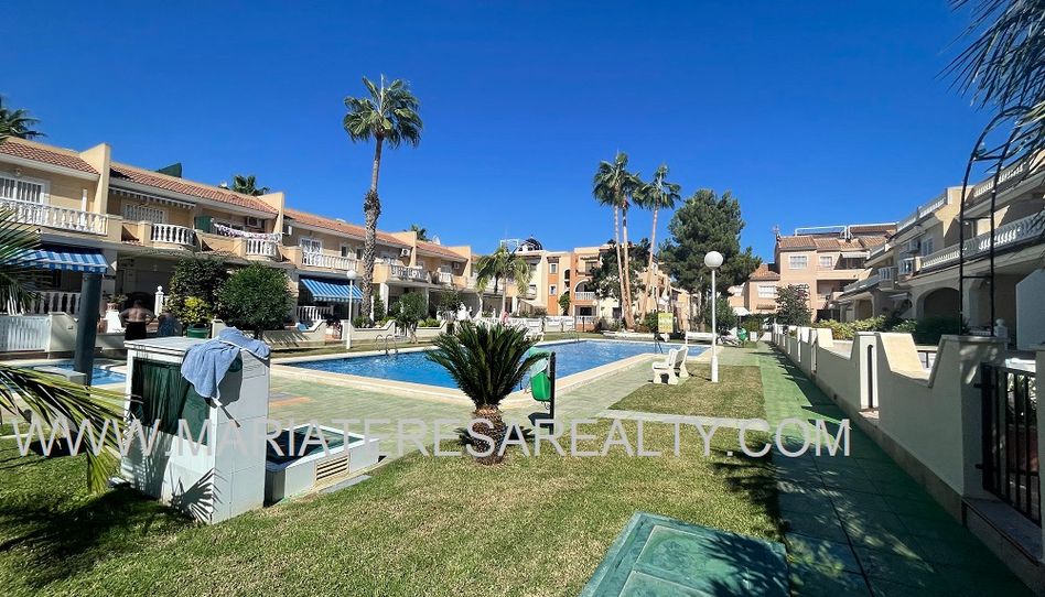 Precioso dúplex adosado con jardín privado orientación Sureste ideal para disfrutar del sol y equipado con toldos. Al entrar a la vivienda en esta planta baja de 36m2 tenemos distribuidos un amplio salón/comedor completamente amueblado y con aire acondicionado, seguido tenemos la cocina de diseño abierto completamente equipada con encimera de granito, a su vez tenemos un aseo, un pequeño hueco bajo la escalera utilizado de trastero y una salida al patio trasero equipado con un amplio trastero que a su vez nos da acceso a la zona comunitaria para acceder a la piscina. Subiendo las escaleras interiores tenemos la planta alta de 40m2 que consta de un amplio dormitorio principal con armario empotrado, aire acondicionado y con salida a un balcón, un cuarto de baño equipado con ducha y un segundo dormitorio equipado actualmente con sofá-cama, armario empotrado y aire condicionado, a su vez desde este dormitorio podemos acceder a una terraza acristalada con cerramiento de aluminio y que nos da acceso a las escaleras de acceso al solario a través de una puerta. En el solario tenemos unos 40m2 totalmente de uso privado equipados con placas solares y un amplio trastero donde se encuentra la lavadora y el termo y es de aproximadamente de unos 6m2.
