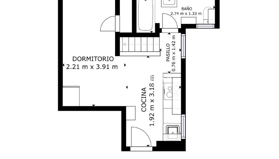 Distribución funcional con cocina abierta, salón diáfano y baño completo con bañera.