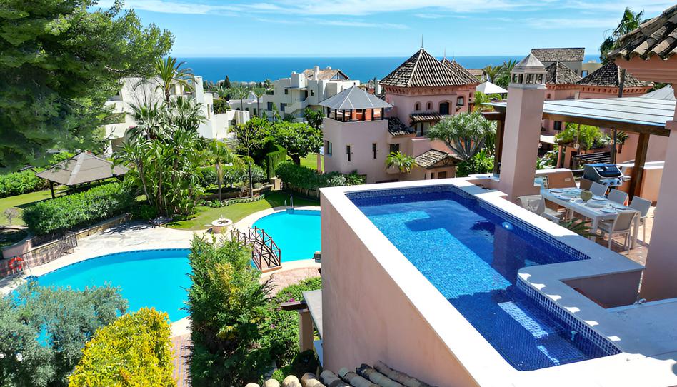 Ubicada en la prestigiosa Cascada de Camoján, en la Milla de Oro de Marbella, esta exquisita casa adosada encarna calidad y estilo de vida. Con una impresionante superficie de 414m², que incluye 350m² de elegantes interiores y 104m² de terrazas acogedoras, esta propiedad ofrece una combinación armoniosa de lujo y confort. Es un refugio orientado al sur, perfectamente situado para capturar impresionantes vistas al mar, campo y montaña, lo que la convierte en una opción ideal para quienes buscan tranquilidad rodeados de naturaleza.
