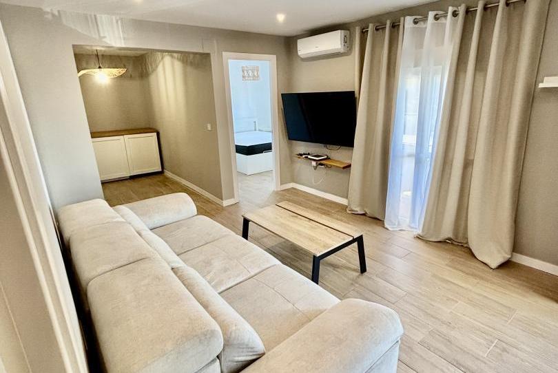 El salón se encuentra completamente amueblado con sofá, mesa y televisión, listo para su uso.