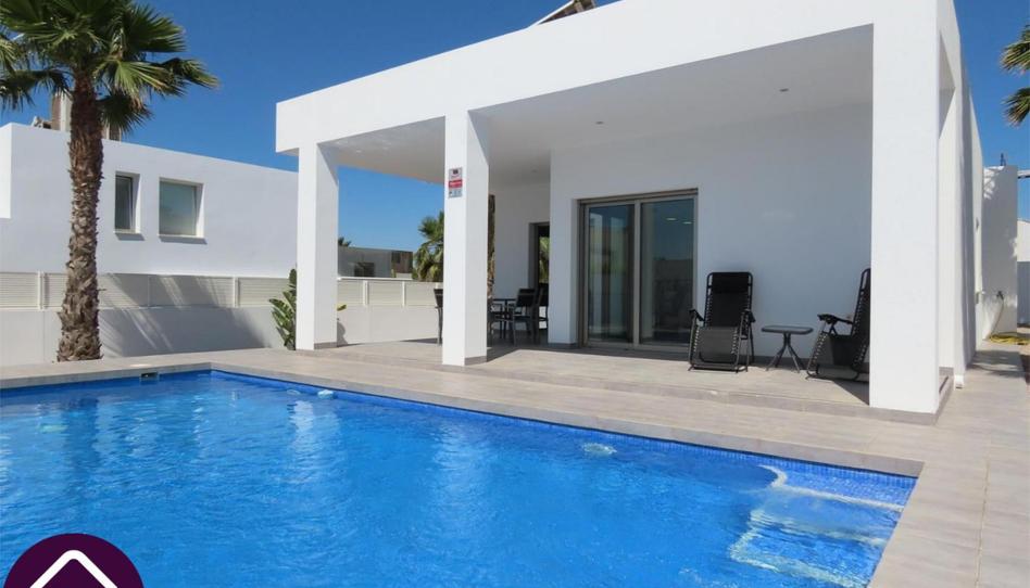 La villa, decorada con buen gusto, se encuentra en una amplia parcela de 500 m² en una tranquila zona de la Urbanización La Marina, en el distrito de San Fulgencio (Alicante). Su piscina de 8 x 4 m disfruta de sol y sombra durante todo el día, con tumbonas y un comedor cubierto a su disposición.