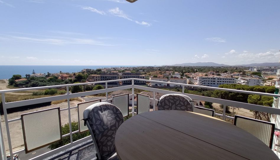 Apartamento en Salinas, orientación sur. Octava planta, luminiso, todo exterior con vistas al mar. Tiene noventa metros cuadrados distribuidos en terraza, salon-comedor, aseo, baño con ducha, cocina nueva, dos dormitorios dobles y uno individual. Dos de los dormitorios tienen armarios empotrados, y hay otros dos armarios empotrados en el piso.