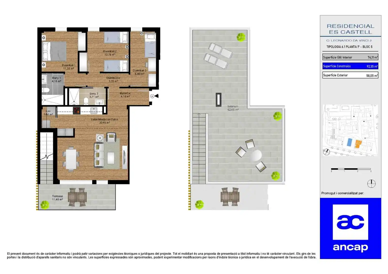 Residencial El Castell consta de 32 viviendas distribuidas en 5 bloques, 16 plantas bajas con jardín y 16 áticos con solárium, de 2 y 3 habitaciones, 2 baños y cocina abierta al salón y terraza.