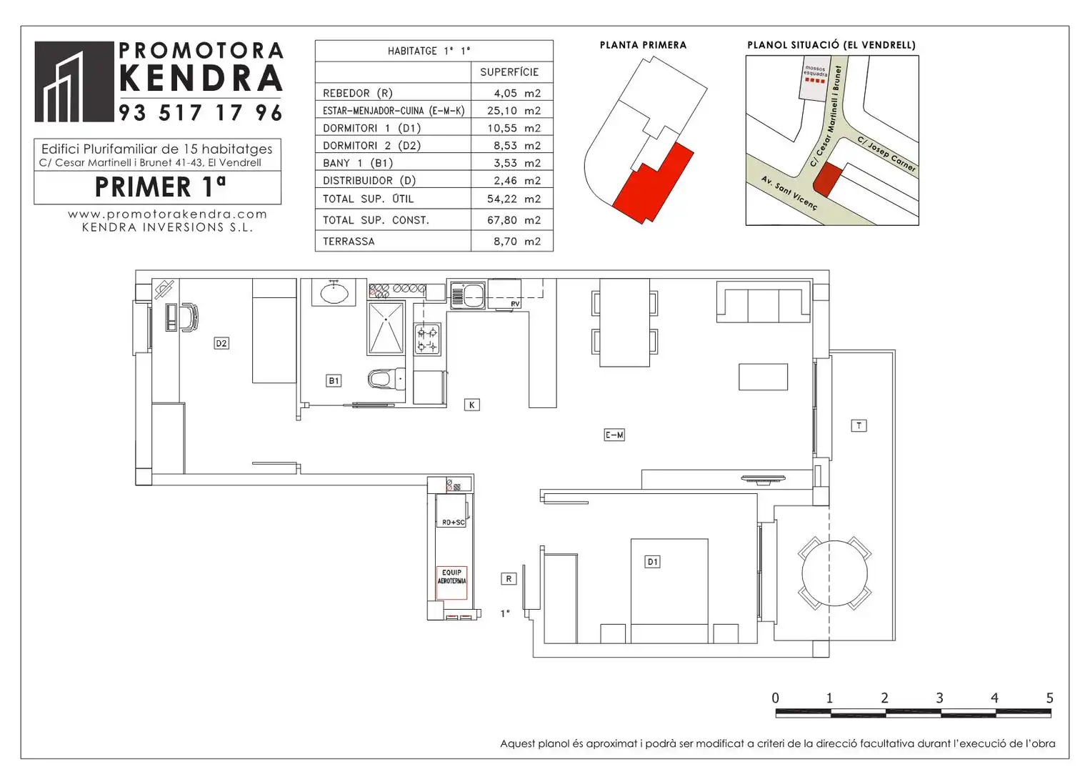 Presentamos la primera fase la promoción Parc Residencial Can Conesa de la Promotora Kendra. Un edificio plurifamiliar de obra nueva distribuido en una única escalera que alberga 15 viviendas de dos y tres dormitorios, un local, trasteros y plazas de aparcamiento. La promoción está situada en el corazón del barrio del Tancat, en una zona muy céntrica de El Vendrell, a escasos minutos andando de todos los comercios y servicios que ofrece el municipio y a tan solo 10 minutos a pie de la estación de autobuses y de Tren Rodalies (R4), que conecta directamente con Vilafranca (20 mins), Martorell (40 mins), Barcelona (75 mins).