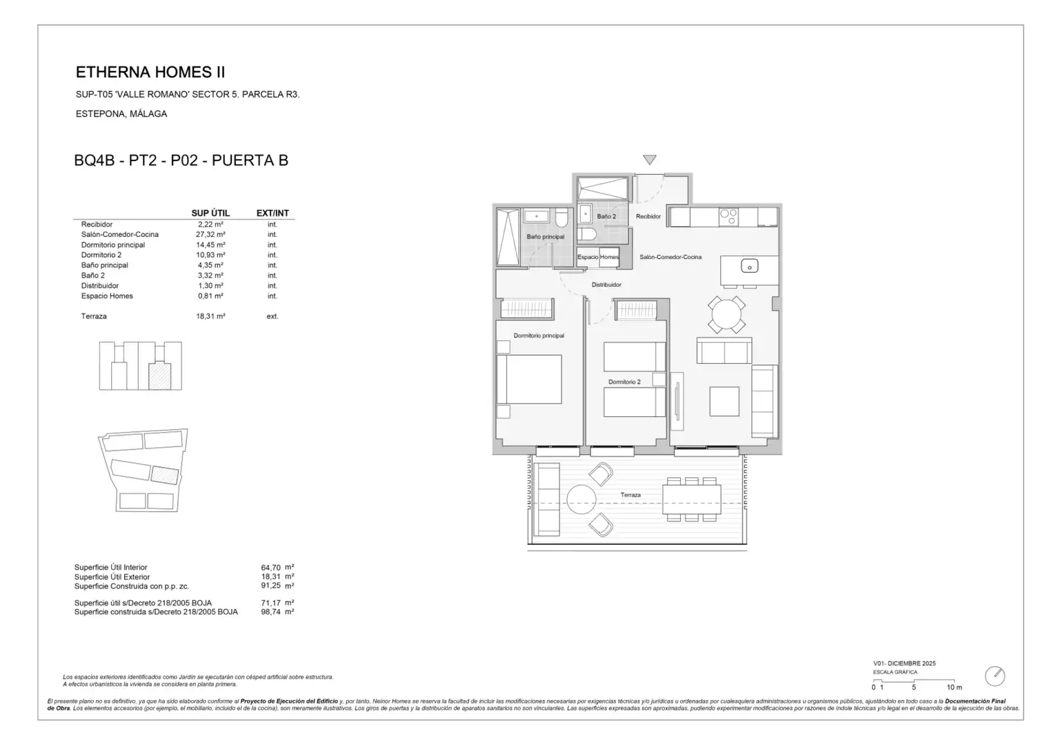 La propiedad cuenta con una superficie útil interior de 64,70 m² y una terraza exterior de 18,31 m². Los espacios se organizan de la siguiente manera: