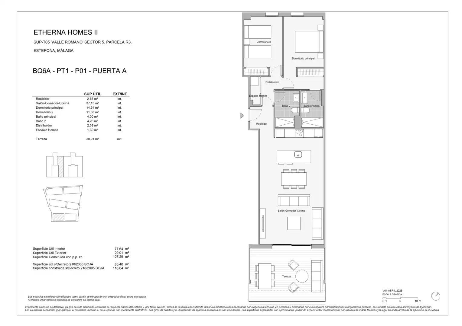 La propiedad cuenta con una superficie útil interior de 77,64 m² y una terraza exterior de 20,01 m². La distribución se organiza de la siguiente manera: