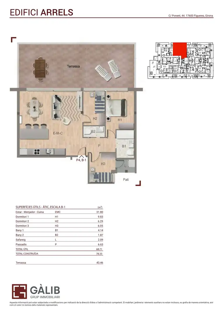 Es presenta una oportunitat única d'adquirir un acollidor àtic en venda en la localitat de Figueres. Aquest immoble, amb una superfície construïda de 78 m², es troba en la quarta planta d'un edifici modern, accessible mitjançant ascensor. Ideal per a famílies o parelles, compta amb tres habitacions ben distribuïdes i dos banys complets, oferint així funcionalitat i comoditat.
