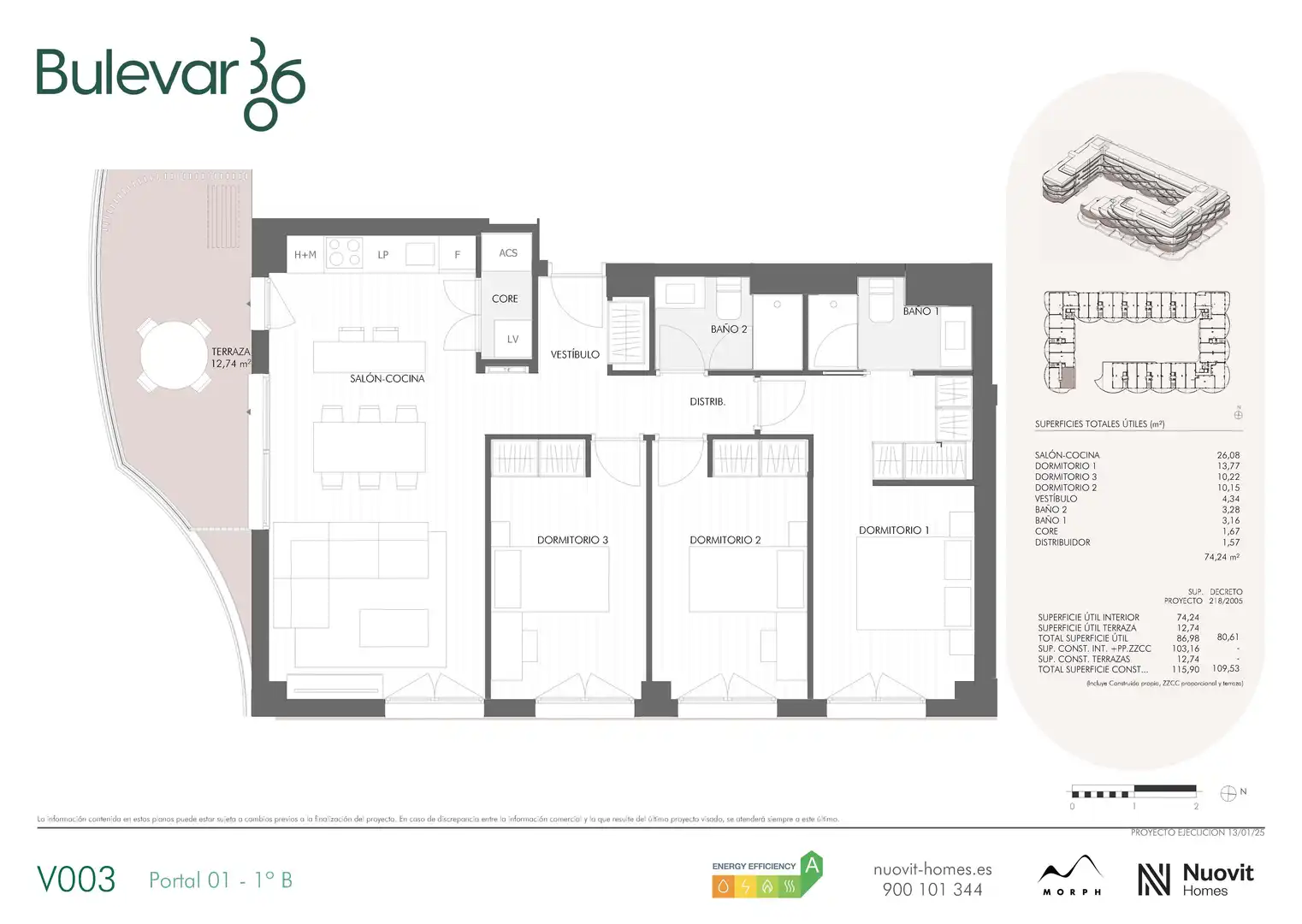 El proyecto se extiende sobre una superficie de 7.722,05 m² y alberga 165 viviendas distribuidas en 5 alturas, todas con amplias y luminosas terrazas. El proyecto incluye viviendas de 1 a 4 dormitorios, con tamaños que oscilan entre los 60,9 m² y los 193,6 m².