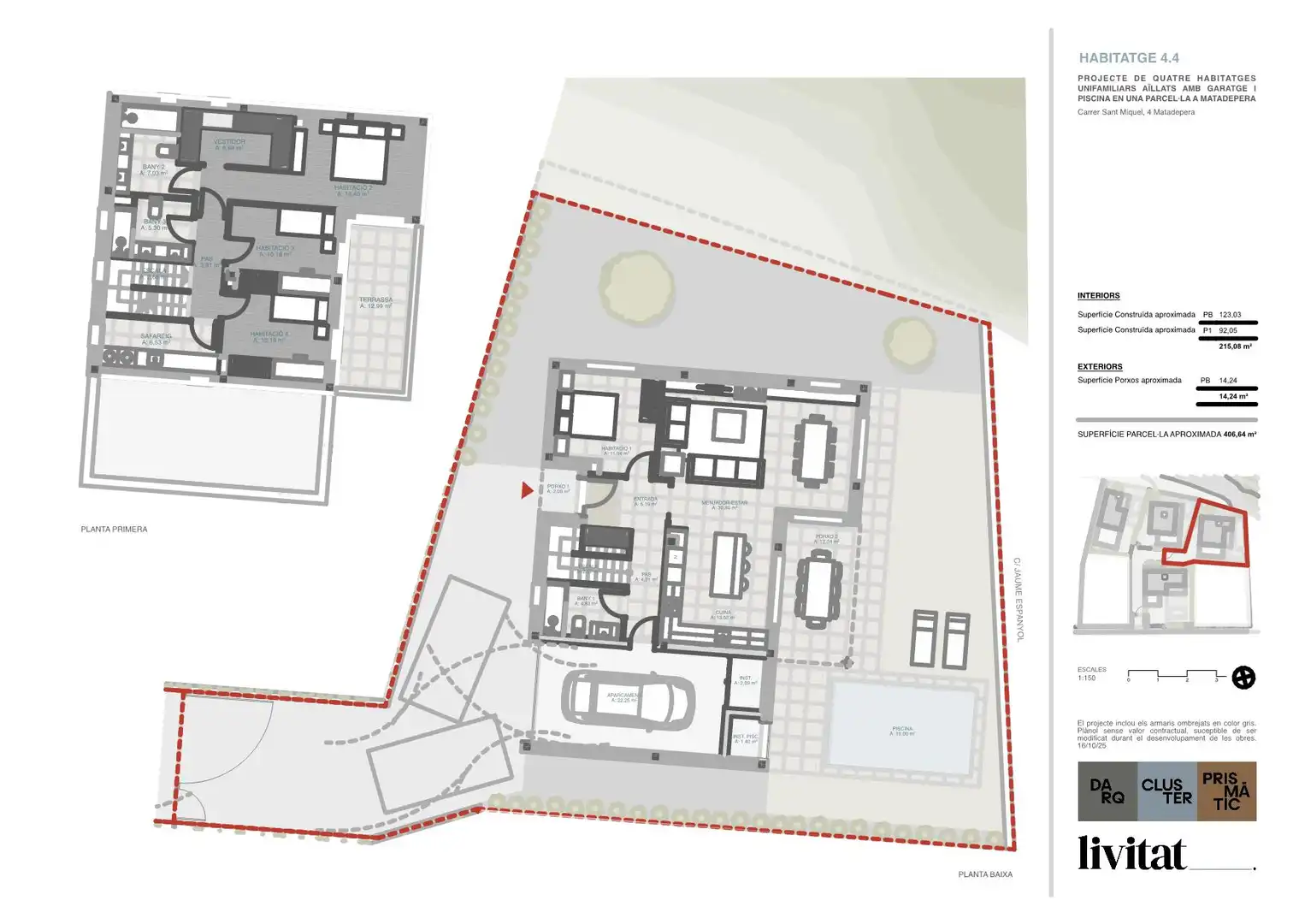És un projecte de 4 cases situat, al meu criteri, en la millor zona de Matadepera: lluny del soroll del centre i de la carretera, envoltat d’arbres i tranquil·litat, però a només 2 minuts caminant de la plaça Sant Jordi i de les parades d’autobús. Un entorn privilegiat i còmode alhora.