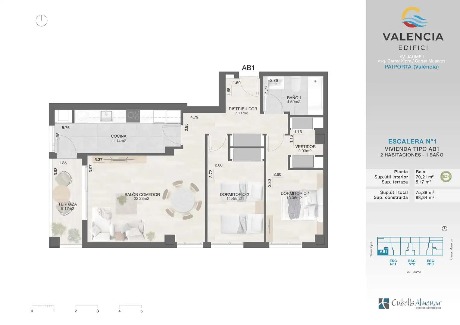Vivienda en planta baja de obra nueva, ubicada en la calle Jaime I de Paiporta, frente a la pista de patinaje. 88 m2 distribuidos en salón comedor con terraza de 5 m2, cocina independiente. 2 dormitorios con armarios empotrados y 1 baño completo con ducha. Plaza de aparcamiento y trastero incluido en el precio. Excelentes calidades. Las imágenes, son orientativas y buscan mostrar el estilo y calidades de la promoción, pudiendo no corresponderse exactamente con esta tipología de vivienda.