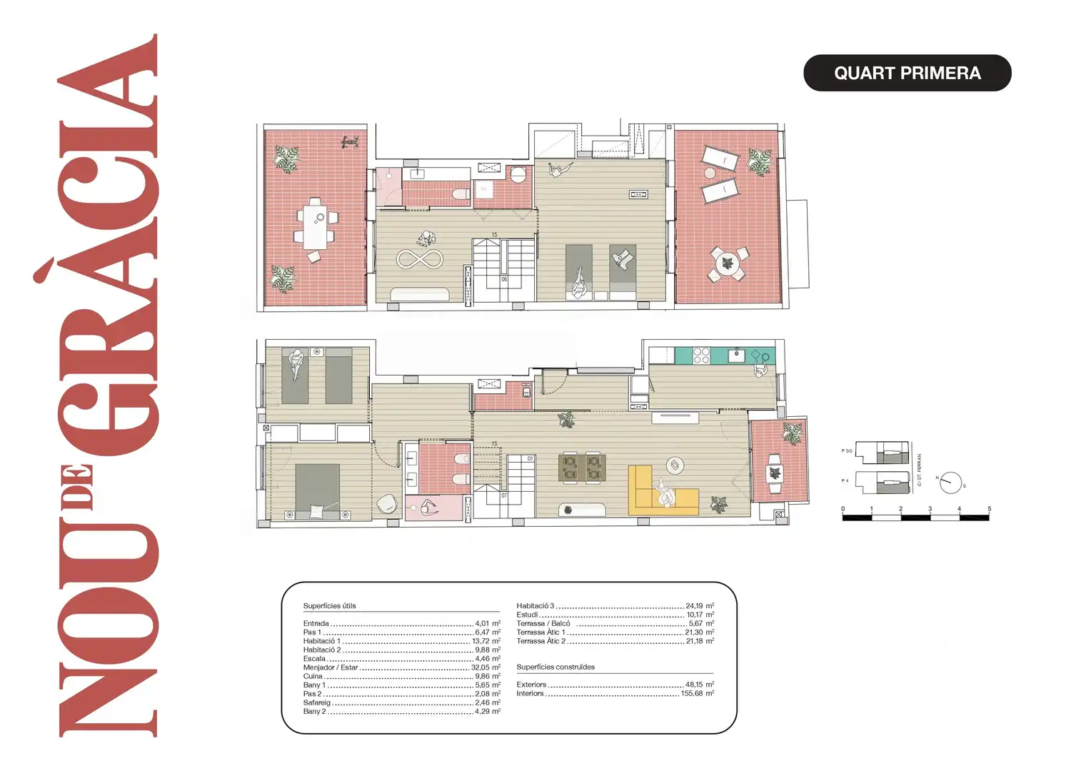 NOU DE GRÀCIA se ha diseñado dando valor a la vivienda, buscando doble orientación, sur en las zonas de día, y norte en las zonas por la noche previendo la buena ventilación, calidad y confort que, desde un punto de vista arquitectónico, toda vivienda tendría que tener.