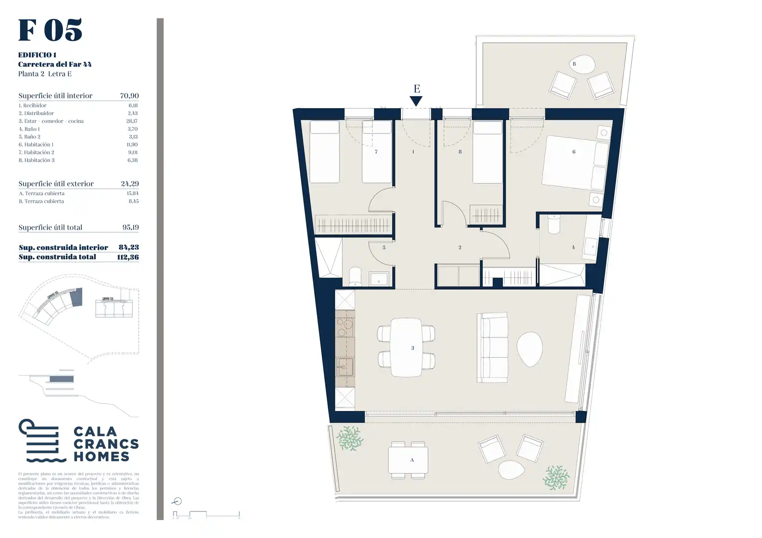 Cuenta con una distribución funcional que integra cocina abierta y salón-comedor, conectando con amplios espacios exteriores según tipología. Dispone de 3 dormitorios y 2 baños, con estancias luminosas gracias a sus grandes ventanales y excelente orientación.