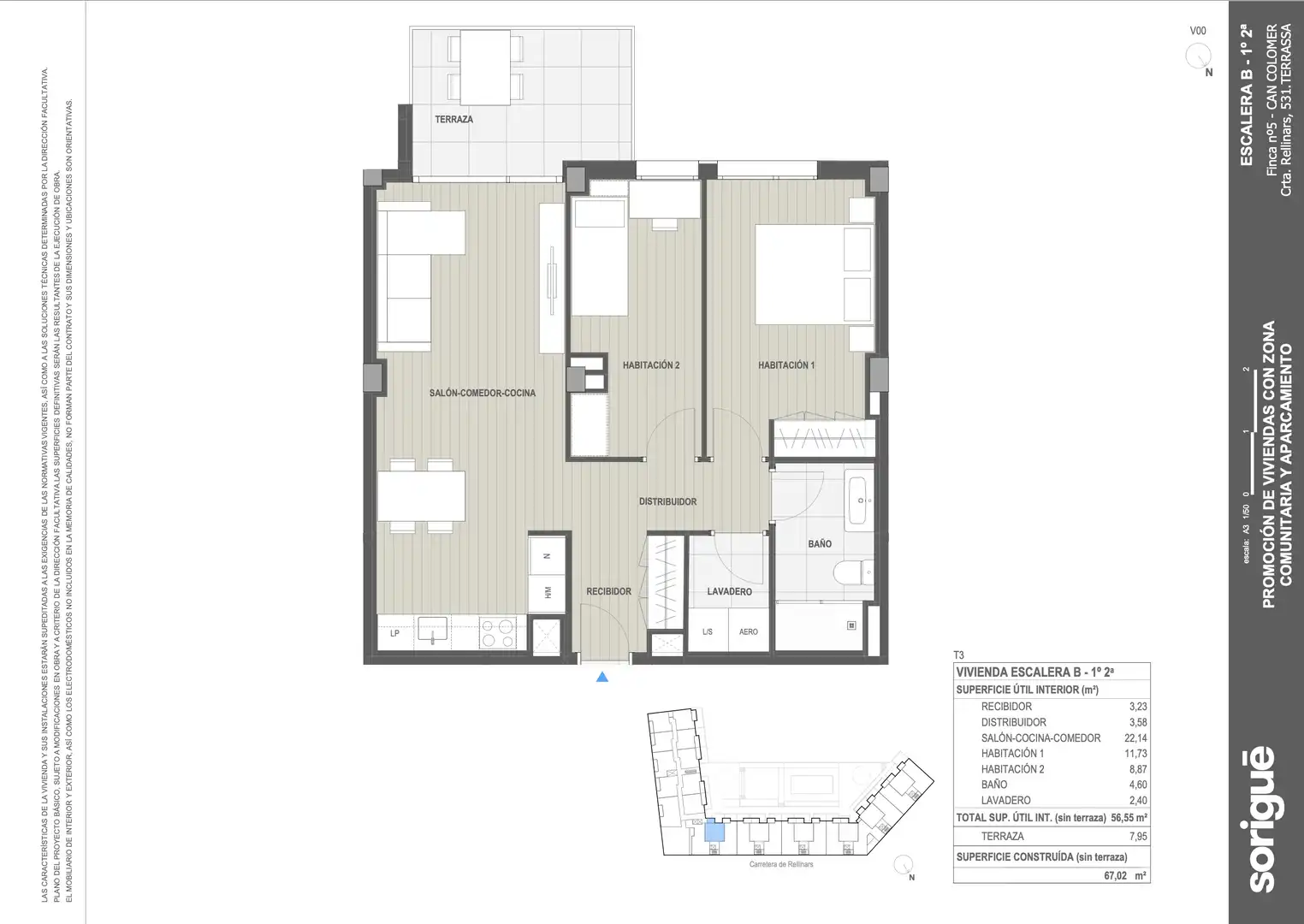 Vivienda ubicada en tercera altura, disponible en alturas superiores con incremento de valor, su superficie construida esde 67,02 m2, su superficie útil es de 56,50 m2, dispone de una terraza de 7,95 m2. La vivienda consta de 2 habitaciones, una individual y otra doble con baño incorporado. Posibilidad de generar un baño adicional. Gran salón comedor con salida directa a terraza. Cocina con electrodomésticos incluidos. Parking y tasrtero no incluidos en el precio.