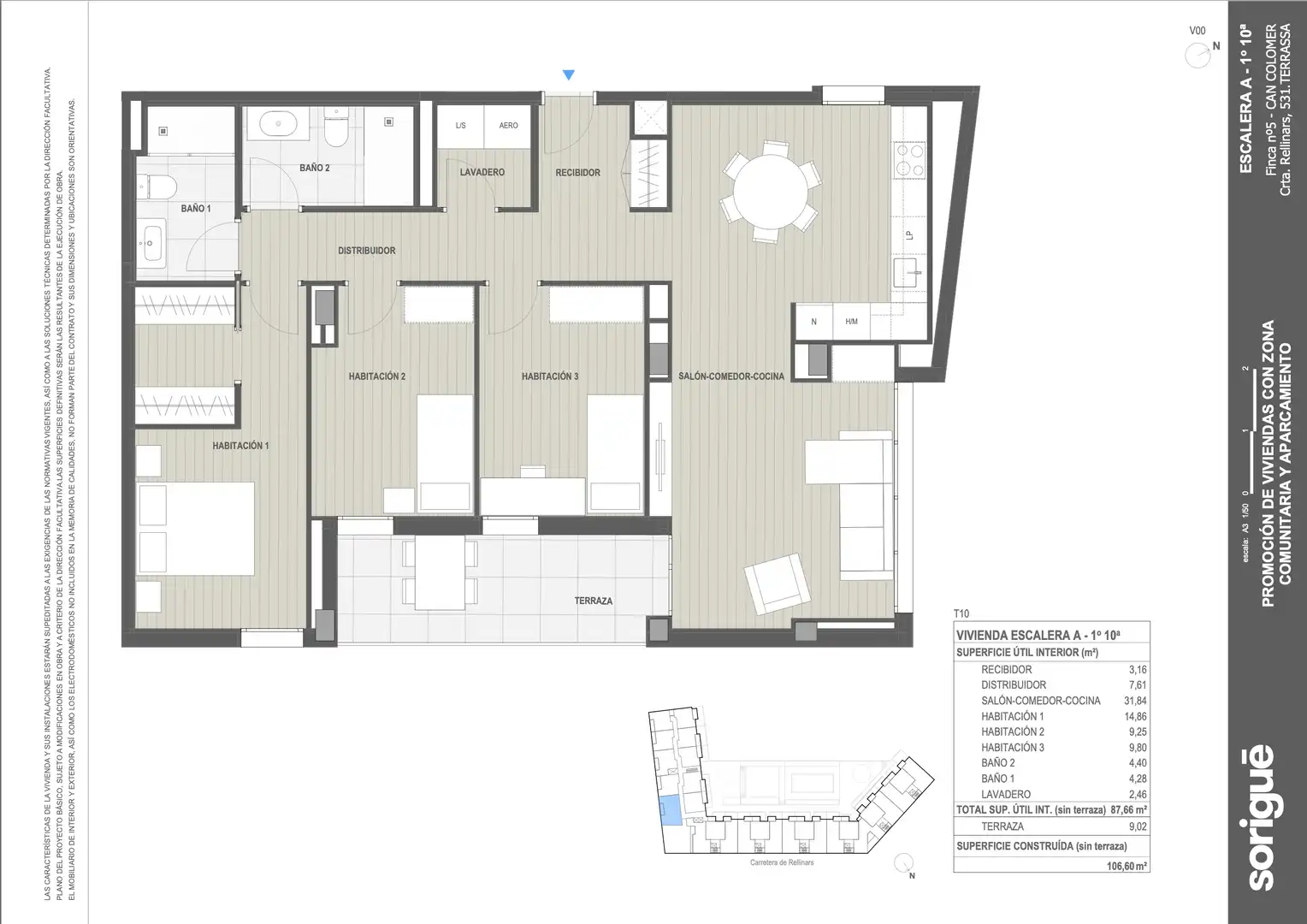 Vivienda ubicada en quinta altura, su superficie construida esde 106,60 m2, su superficie útil es de 87,66 m2, dispone de una terraza de 9,02 m2. La vivienda consta de 3 habitaciones dobles, siendo una de estas tipo suite con baño incorporado. Gran salón comedor con salida directa a terraza y ventana esquinera. Cocina con electrodomésticos incluidos. Parking y tasrtero no incluidos en el precio.