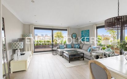 Engel & Völkers presenta esta impresionante propiedad es totalmente exclusiva, por la calidad de los materiales, su diseño, localización y espectacular terraza de 86m2. ¡Una auténtica maravilla! Este precioso y luminoso ático tiene una magnífica distribución. Al entrar en la vivienda tenemos un hall que distribuye, por un lado, el salón comedor y cocina y, por otro, la zona de descanso con tres dormitorios y dos baños completos con ducha. La vivienda, de 106 m2 construidos, tiene estancias amplias y una buena distribución, ocupando toda la sexta planta con una excelente orientación sur/oeste y norte. Desde la terraza disfrutamos de unas preciosas vistas despejadas y se puede acceder a ella directamente desde el salón, la cocina y el dormitorio principal. Las calidades son extraordinarias: Edificio de fachada de mármol travertino y sistema de ventilación para aislar del frío/calor y ruidos. Domótica para controlar calefacción / aire por estancia, iluminación interior y exterior, persianas, alarmas de incendio e inundación y sistema de riego de la terraza. Calefacción por suelo radiante porcelánico, (Porcelanosa) imitación madera color gris. Armarios lacados, destacamos su cantidad y calidad. Persianas acorazadas de seguridad. Aire acondicionado por conductos e individual por habitación. Certificado energético A. La cocina de diseño cuenta con electrodomésticos Siemens y muebles de Zelari de Nuzzi de gran capacidad. Los muebles de los baños son de la firma Santos. La terraza tiene suelo de madera técnica (Madertech) y de diseño que incluye jardineras y armarios para ocultar riegos y utensilios. Cuenta con cuatro pérgolas y toldos automatizados, un sistema de iluminación a tres niveles, así como enchufes de exterior por toda la planta. La terraza cuenta con más de 40 metros lineales de cuidada vegetación. La vivienda además, incluye dos plazas de garaje contiguas de 11m2 cada una y trastero de 6m2 y fácil acceso en la planta -1. La urbanización es muy moderna y exclusiva. Cuenta con conserje, piscina, sala de juegos y jardín infantil. Esta espectacular vivienda, respira confort, elegancia y buen gusto en todas sus estancias. ¡Os animamos a visitarla y vivir la experiencia! Su ubicación dentro del barrio de Sanchinarro es inmejorable, al lado de los hospitales, el centro cultural y el polideportivo. A tres calles del corazón de Sanchinarro, Calle príncipe Carlos donde se pueden encontrar restaurantes, bares, tiendas, etc. A cinco minutos a pie del Corte Inglés y el metro ligero. Sanchinarro es un barrio joven del Norte de Madrid que colinda con la emblematica urbanizacion de la Moraleja, el Pau de Valdebebas y el area residencial de Las Tablas. A tan solo 15 minutos del centro de Madrid y a 10 minutos del aeropuerto, Sanchinarro se ha consolidado como una de las zonas de preferencia tanto para familias como para personas que buscan estar conectadas con el centro de la ciudad y la zona empresarial mas prestigiosa de la capital, sin renunciar a la tranquilidad y comodidad que proporciona la vida de las urbanizaciones de Sanchinarro.