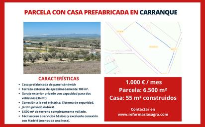 PARCELA de 6.500 m² con CASA PREFABRICADA –VENTA y/o ALQUILER con OPCIÓN a COMPRA en CARRANQUE – OPORTUNIDAD de INVERSIÓN. Parcela de 6.500 m² con Casa Prefabricada, Terraza, Garaje ¿Buscas naturaleza, tranquilidad y rentabilidad? Inmobiliaria & Reformas La Sagra te ofrece en EXCLUSIVA esta espectacular finca en Carranque (Toledo), ideal tanto para inversión como para disfrutar de la naturaleza con todas las comodidades, con vistas panorámicas hasta la Sierra de Ávila. Ideal como refugio personal, inversión de futuro. ¡Disponible en venta directa o alquiler con opción a compra! (se solicita prima de entrada). Características Principales: - Parcela rústica de 6.500 m², rodeada de vegetación natural. - Casa prefabricada de panel sándwich de 54 m² construidos en una sola planta: - Salón-comedor con cocina americana. - 2 dormitorios dobles. - 1 baño completo con plato de ducha. - Terraza exterior de 100 m² con acceso directo desde el salón. - Garaje exterior privado de 36 m². Extras que marcan la diferencia: - Conexión eléctrica disponible con licencia municipal y pre instalación en la vivienda. - Licencia de vallado aprobada. - Pre instalación para depósito subterráneo de agua potable de 20.000 L (el llenado anual cuesta solo unos 350 €). - Licencia solicitada para pozo de agua (en proceso, sujeto a aprobación). - Sistema de seguridad, puerta blindada, carpintería de aluminio y suelos de tarima. - Vistas espectaculares desde una colina: naturaleza, silencio y horizonte abierto. Ubicación Privilegiada: - Carranque (Toledo) - Calle tranquila, sin tráfico, pero bien conectada. A un paso del río Guadarrama, rutas verdes y espacios naturales. - Rápido acceso a servicios esenciales. - Zona de expansión urbanística con alta proyección de revalorización. - A menos de 1 hora de Madrid. Venta y/o Alquiler con Opción a Compra: - Prima de entrada: 60.000 € - Cuotas mensuales a convenir - Todas las cantidades entregadas se descuentan del precio final. Nota: Se solicita comisión de intermediación a la parte compradora. ¿Tienes un proyecto en mente? ¡Nosotros lo hacemos realidad! En Inmobiliaria & Reformas La Sagra no solo compras una finca, también puedes construir con nosotros tu nuevo hogar: - Servicio integral de construcción y reformas: - Precios competitivos y proyectos a medida. - Asesoramiento con arquitectos y técnicos. - Tramitación de licencias y dirección de obra. - Acabados garantizados y supervisión profesional. ¡No dejes pasar esta oportunidad de inversión en una ubicación estratégica! ¿Quieres más información o agendar una visita? ¡Contáctanos hoy mismo a través del botón de WhatsApp de la web! www.reformaslasagra.com Inmobiliaria & Reformas La Sagra Tu inversión segura, con acompañamiento integral y visión a futuro.