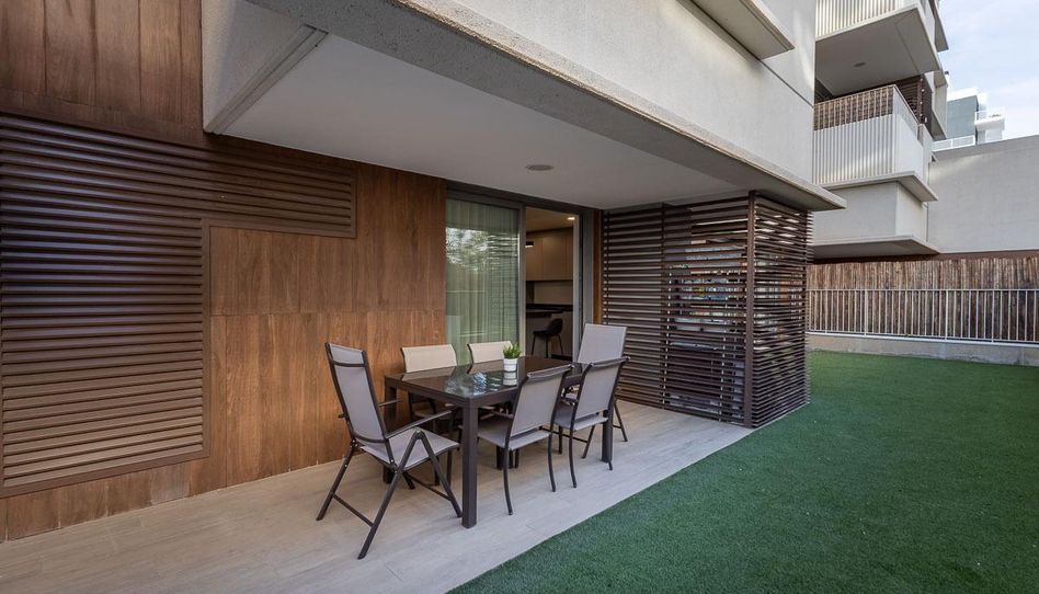 Piso moderno en planta baja con una espectacular terraza tipo jardín con césped artificial que rodea la vivienda y amplia zona de comedor exterior, perfecta para disfrutar del aire libre todo el año. Gran salón-comedor muy luminoso, con grandes ventanales de suelo a techo y acceso directo a la terraza, decorado con estilo actual y suelos de madera que aportan calidez. Cocina abierta de diseño, totalmente equipada, con isla central y barra con taburetes, encimera efecto mármol y abundante espacio de almacenaje.